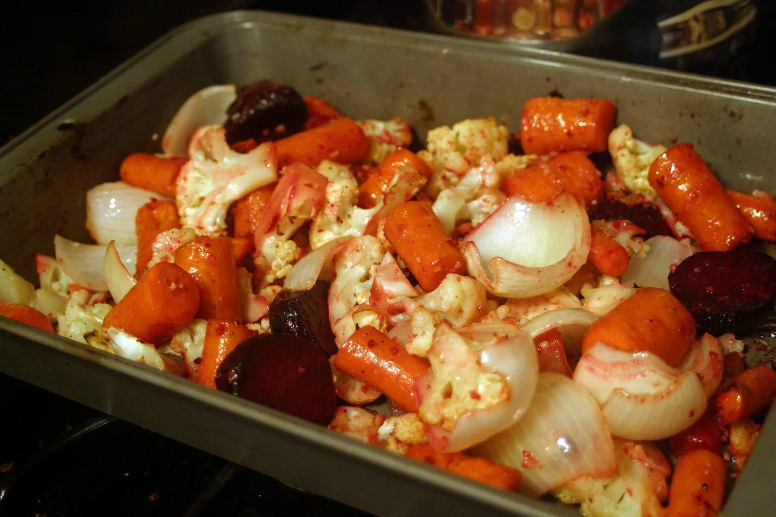 Preheat oven to 450. Mix all Roasted Vegetables ingredients in a large (9×13), deep baking pan. Roast for 35-45 minutes, stirring a few times during roasting, until carrots and beets reach desired tenderness. If you want your cauliflower crunchy, wait to add those until about 10-15 minutes into the roasting time. I like my cauliflower kind of squishy and my beets and carrots a bit crisp, so it works out well for me to roast them all together.