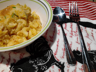- Spray a baking dish (8x8) with non-stick spray. Add pasta and "chicken," then pour cheese sauce over and mix throughly until everything is coated. Sprinkle with additional grated cheese and bread crumbs/masa. Bake for 25 minutes or until cheese is golden brown. Remove from oven and immediately top with gorgonzola, green onions, and cilantro. Drizzle with buffalo wing sauce.