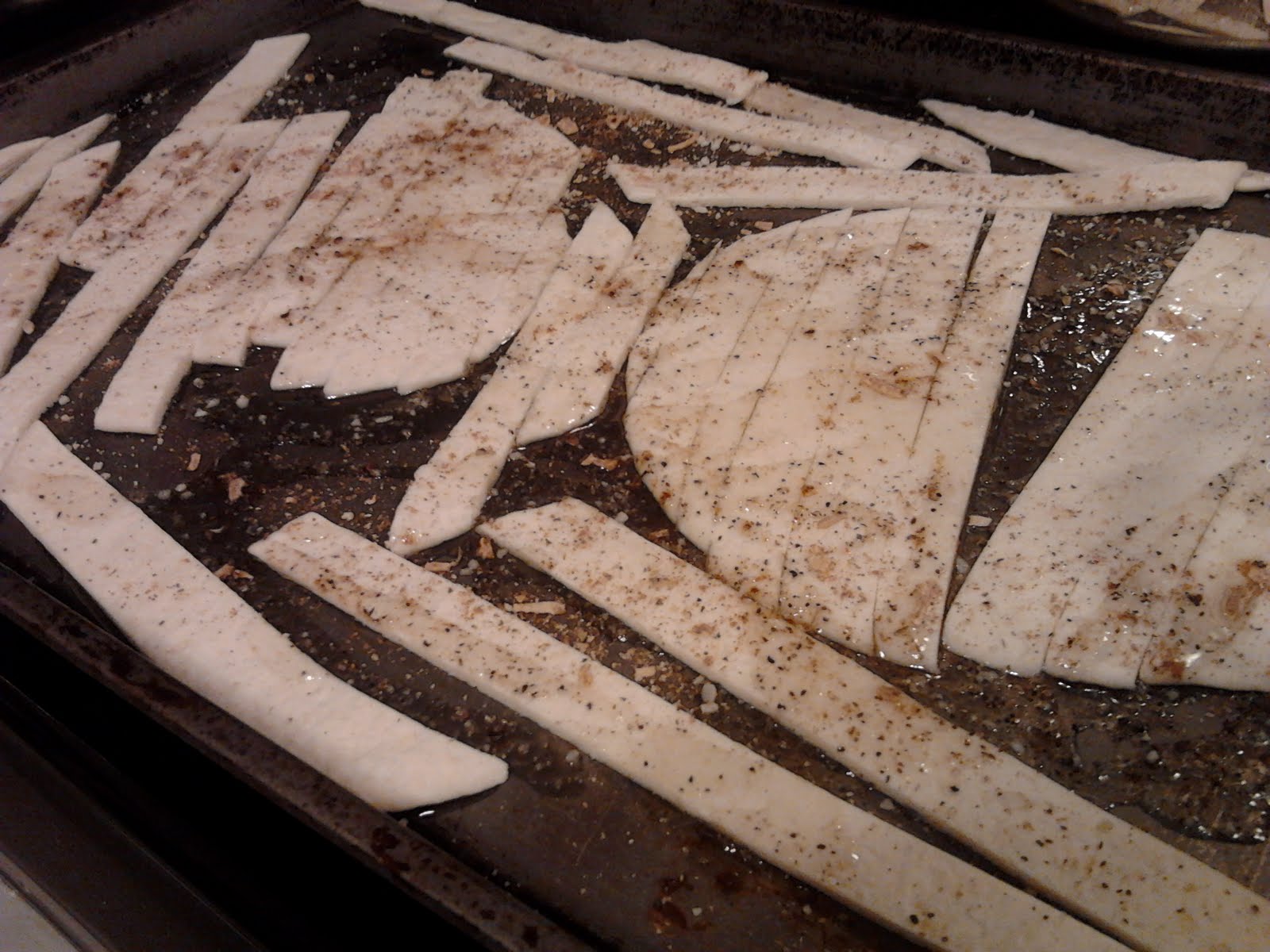 While eggs are scrambling, cut tortillas into strips and preheat oven to broil. Cover tortilla strips in olive oil (about 2-3 Tablespoons) and sprinkle with House seasoning and taco seasoning. Broil for about 5 minutes, or until crispy. If necessary, flip strips and broil for an additional 2 minutes.