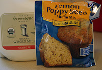 When I realized I had these delicious homemade Lemon Poppyseed Muffins scheduled to bake, I decided it was kismet. I dug out that bag o’ instant muffins and decided to do a little comparison between the homemade and the instant muffins. First up, in the comparison the ingredients. The instant muffins are of the “just add milk” variety. So, all I needed for those was the package and the milk. I used organic whole milk, which seems a little silly considering what’s on the label, but organic is all I keep on-hand. As for the label ingredients, I think my favorites include the aluminum-filled baking soda and the anti-caking agents for the powdered eggs.