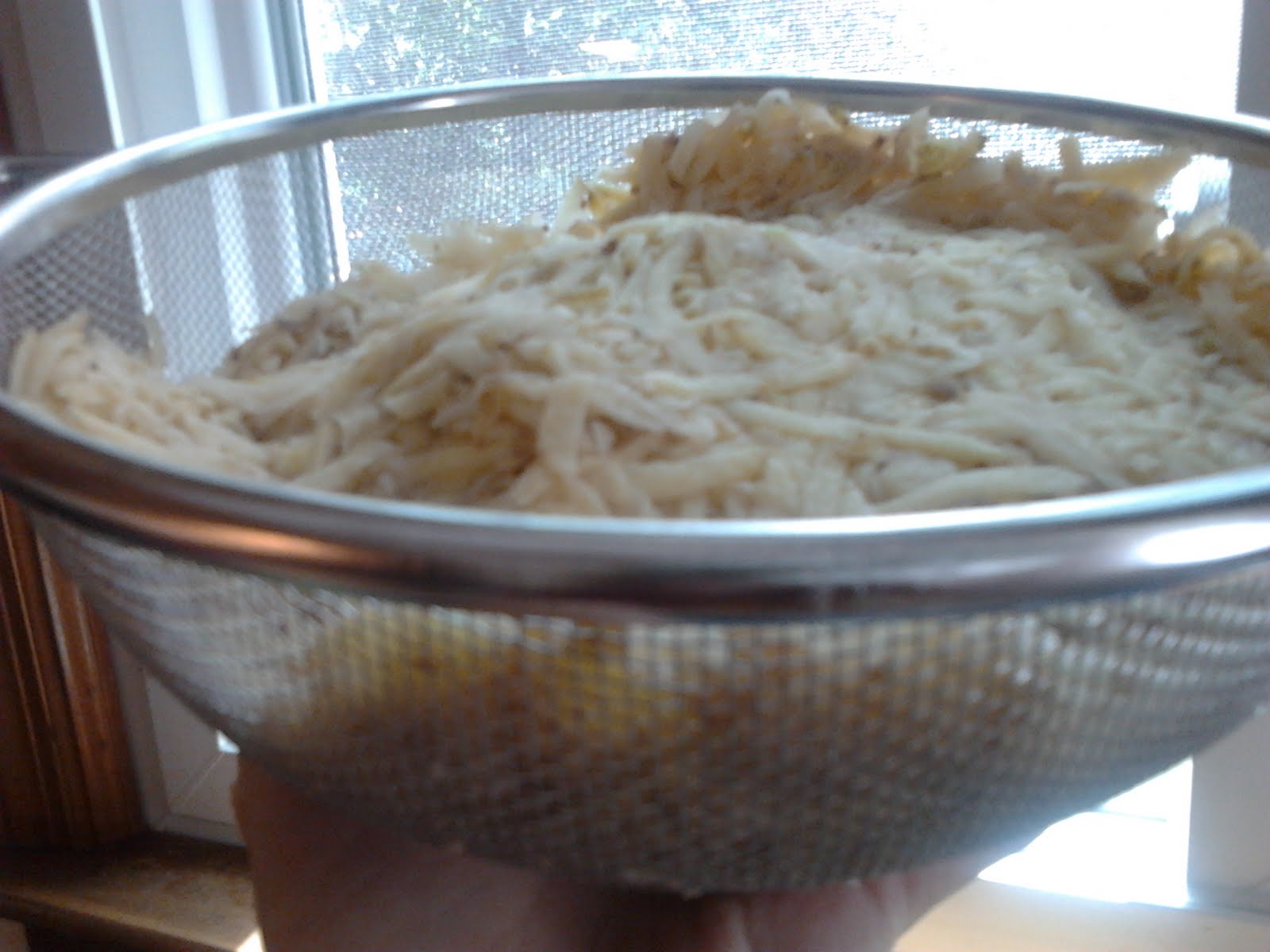 Place shredded potatoes in a sieve or a bowl lined with cheesecloth. Press out excess water.