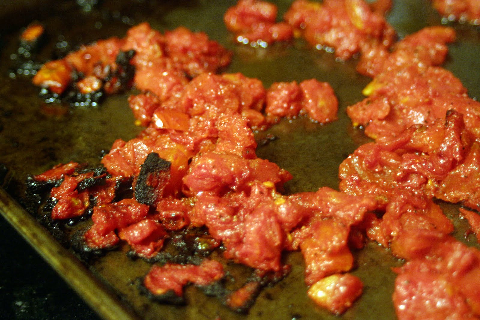 Strain the tomatoes, reserving the juices, and spread onto a baking sheet, season with salt and pepper, to taste, drizzle with 1/4 cup of the olive oil and roast until caramelized, about 15 minutes.