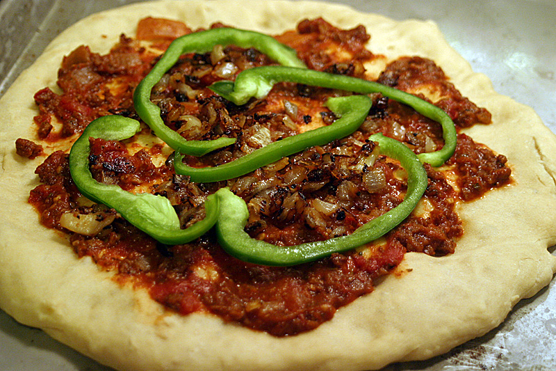 Prepare dough as directed. Pre-bake at 425 for 7-8 minutes. Meanwhile, saute onions and garlic in a bit of olive oil. Top crust with bolognese, onion and garlic mixture, green pepper slices, Mozarella, black olives and “pepperoni.”