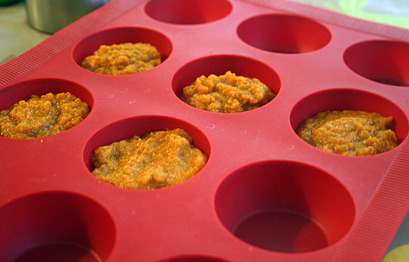 Portion out 1/4 cup per muffin well in each of 8 silicone muffin wells. Freeze. Remove frozen pumpkin “pucks” from silicone muffin tin and place in a freezer bag and refreeze.