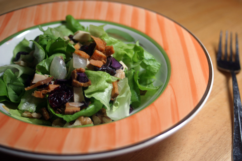 Thanksgiving salad is the perfect way to enjoy leftovers. After a day of culinary debauchery, we’re going to take a break this evening and have our leftovers mixed into a green leafy salad. I think this will be light and delicious and may put a dent in some of our leftovers. You can do this with just about any leftovers. I’ve used our “turkey” roast, our roast vegetables that accompanied that turkey (sweet potatoes and onion), cranberries and walnuts.