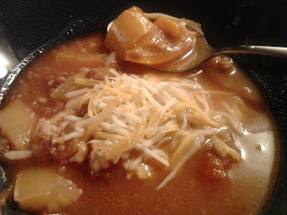 Heat medium soup pot over medium high heat with EVOO. When oil is hot add onions, beef, salt, pepper and chili powder. Thaw the meat, then add garlic, peppers and bay leaf and cook 7-8 minutes or until veggies are tender. Stir in stock and tomatoes and bring to a boil. Add pasta and cook to al dente. Turn off heat, remove bay leaf and fold in basil. Serve in shallow bowls with grated cheese on top. Top with cheese and put under the broiler until the cheese was bubbly and starting to brown.